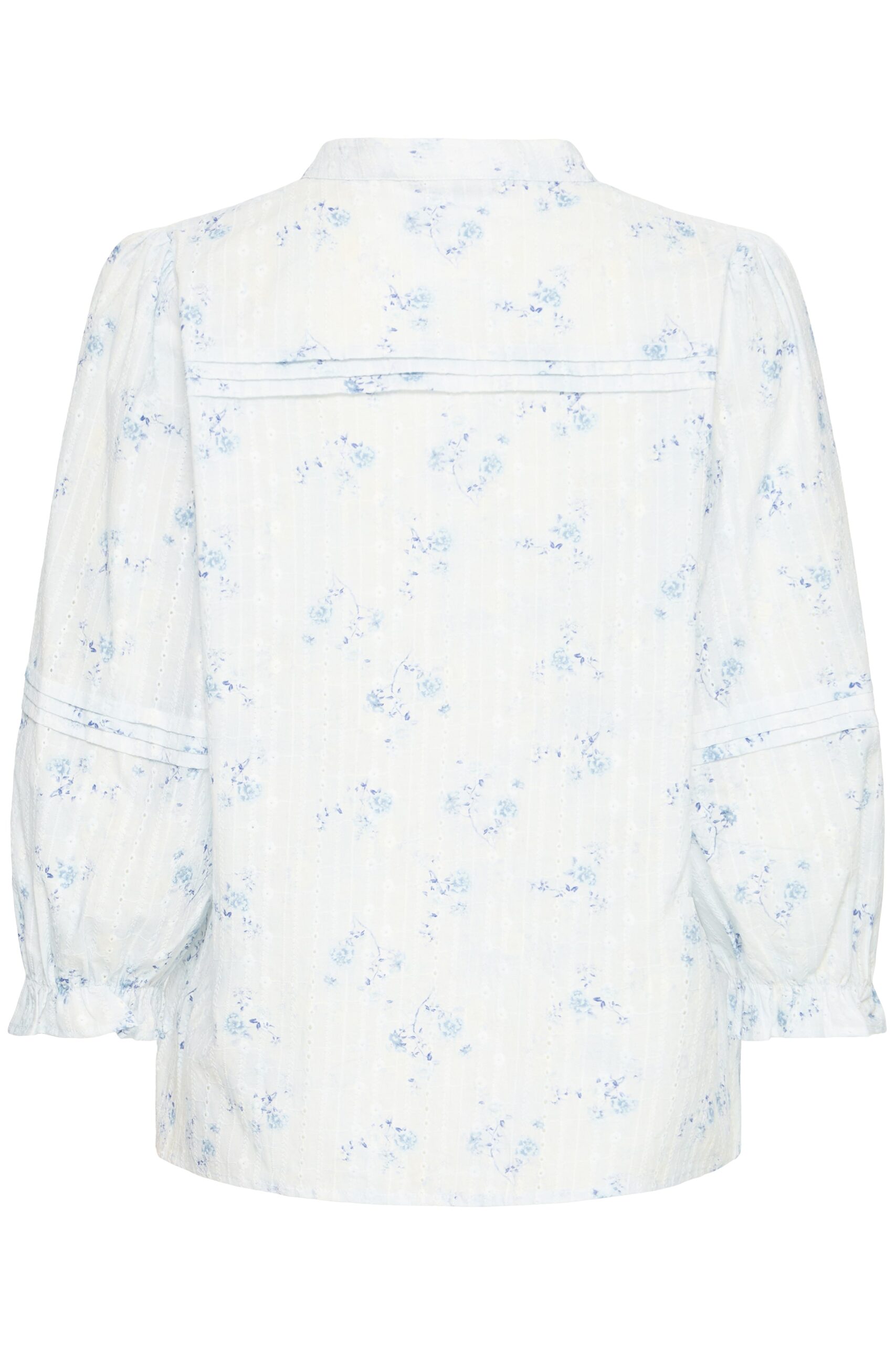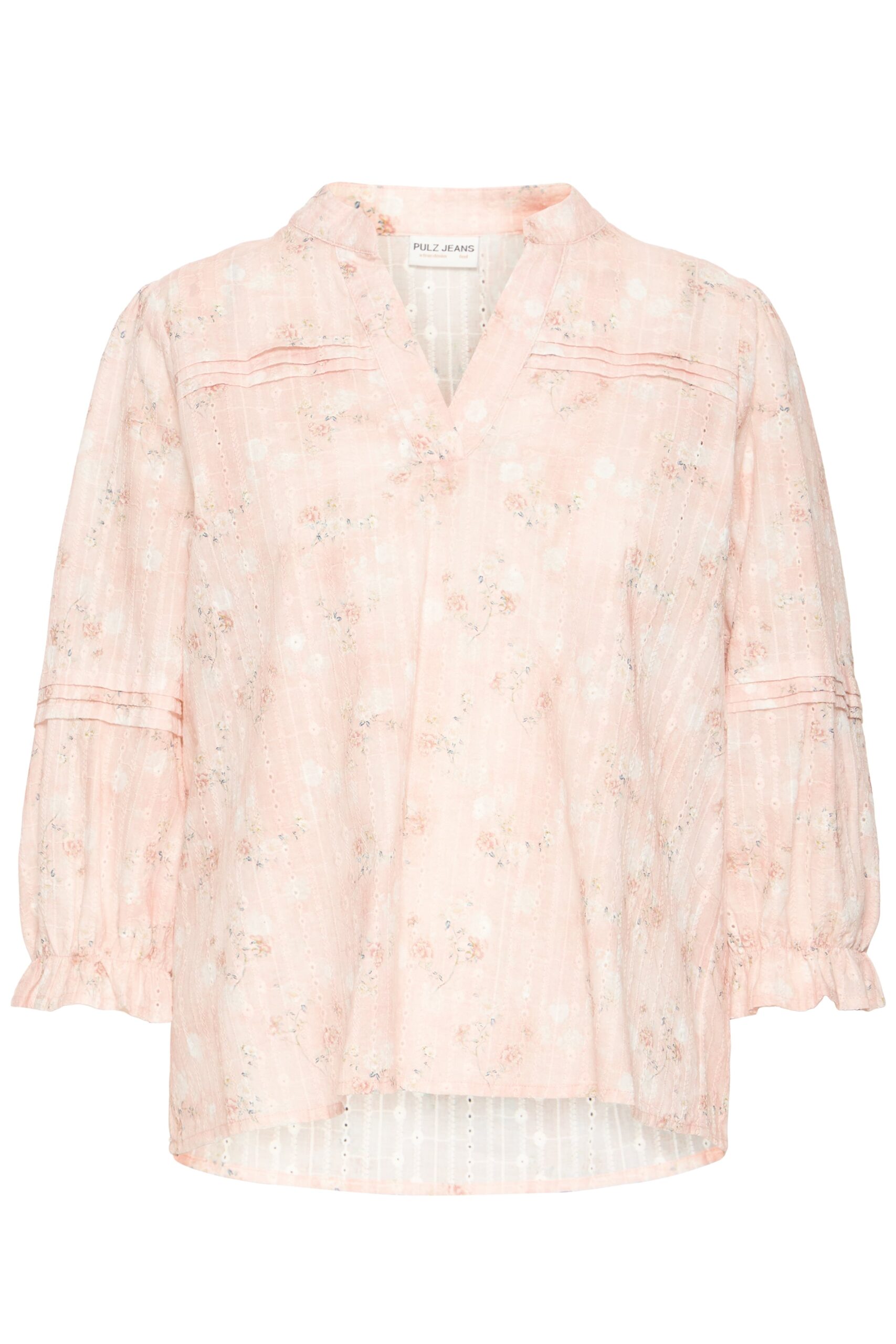Blommig blus från Pulz med volangdetaljer. V-ringad och rak passform. Något längre baktill. Finns i 2 färger.