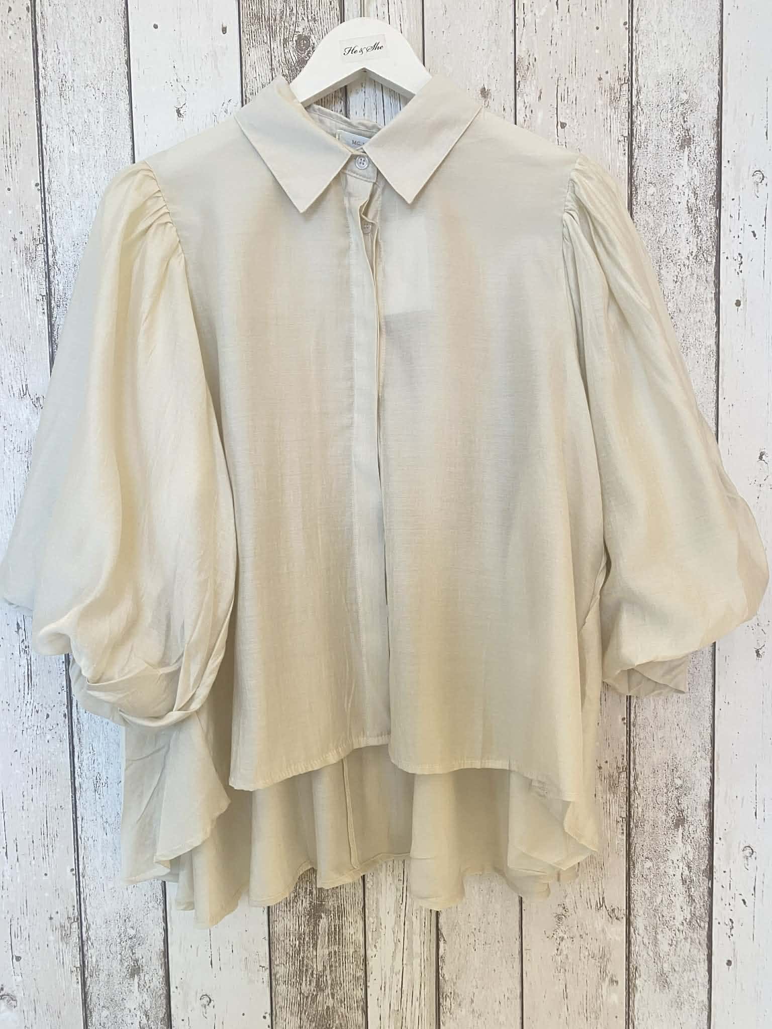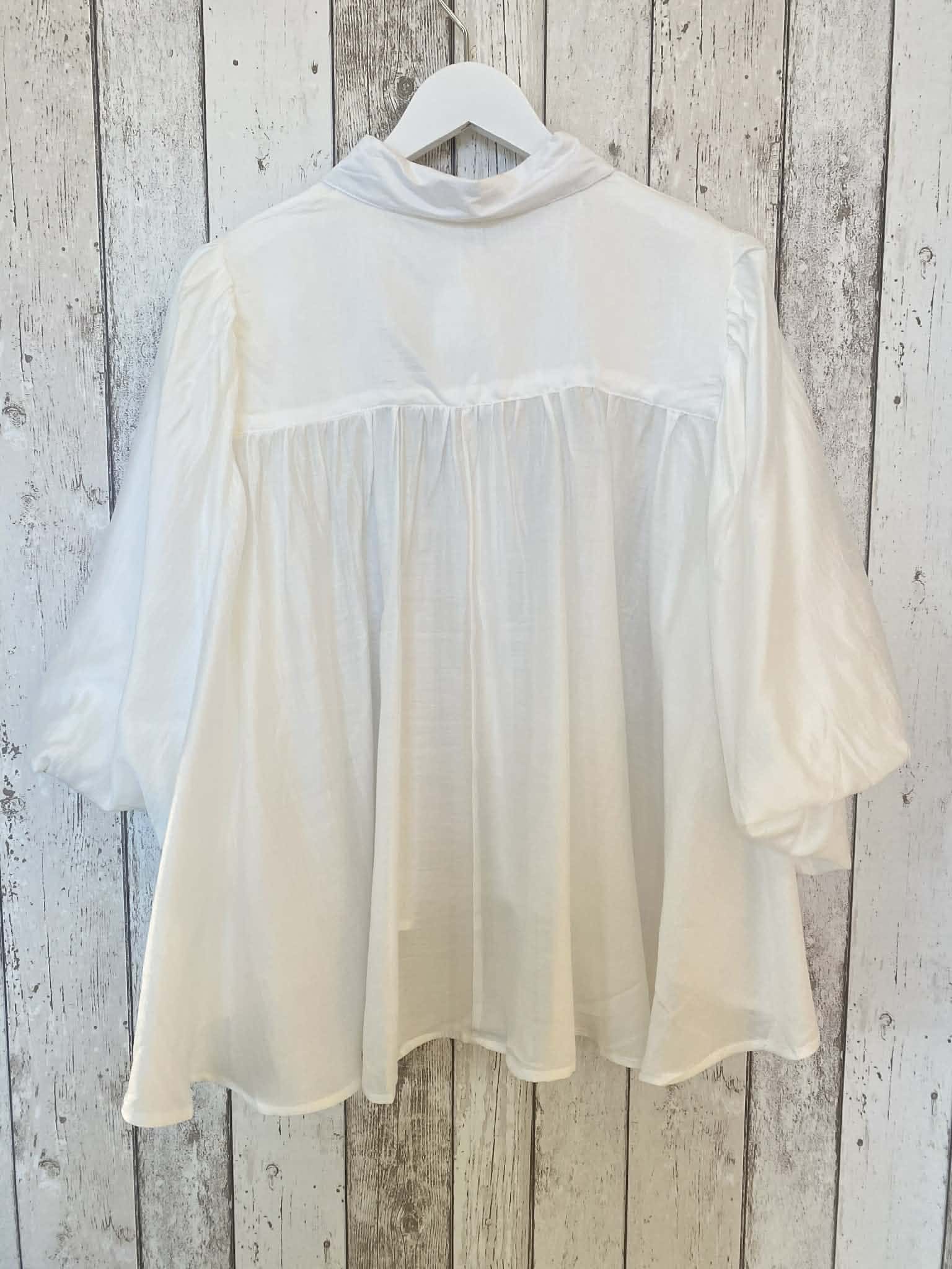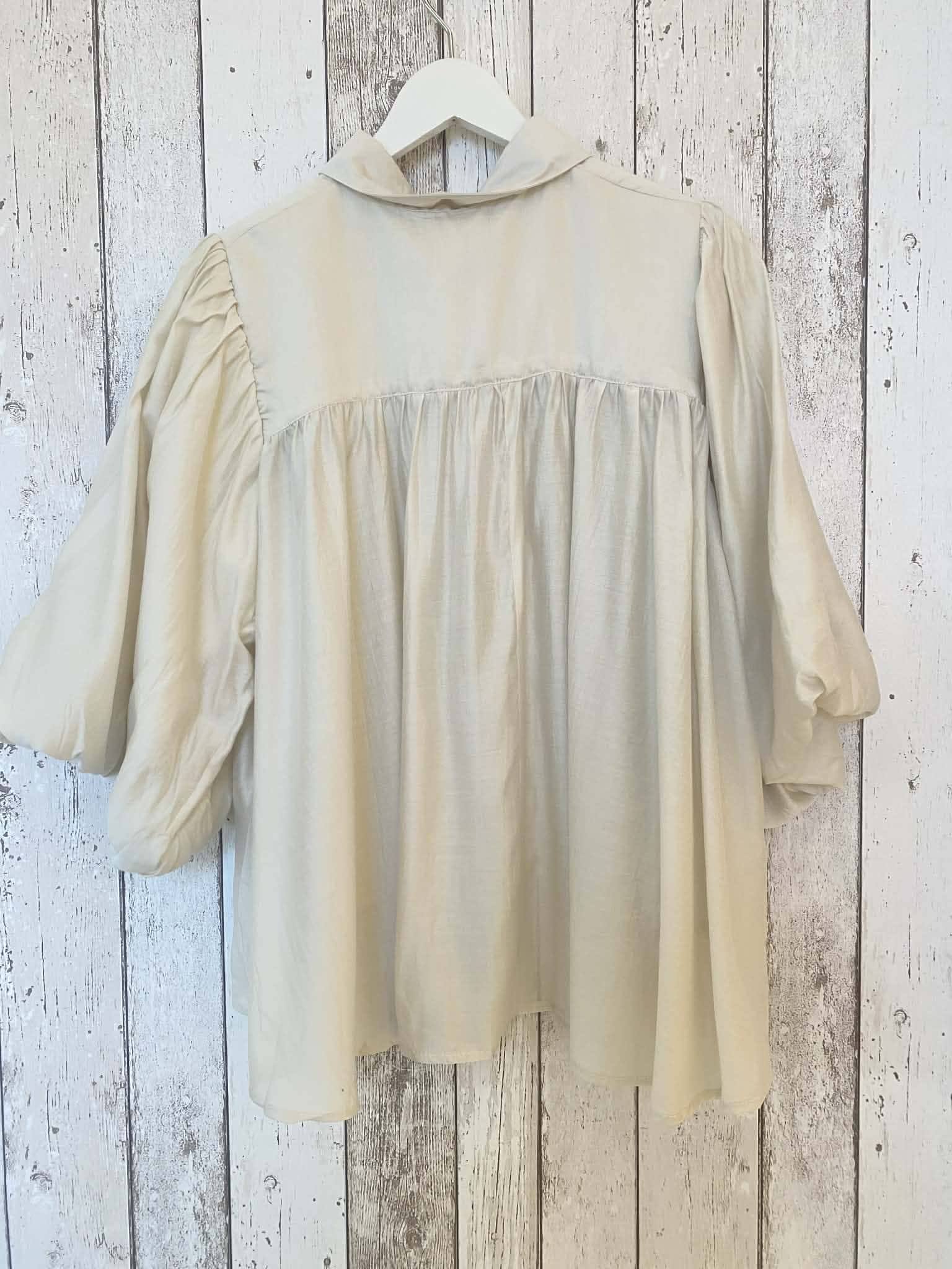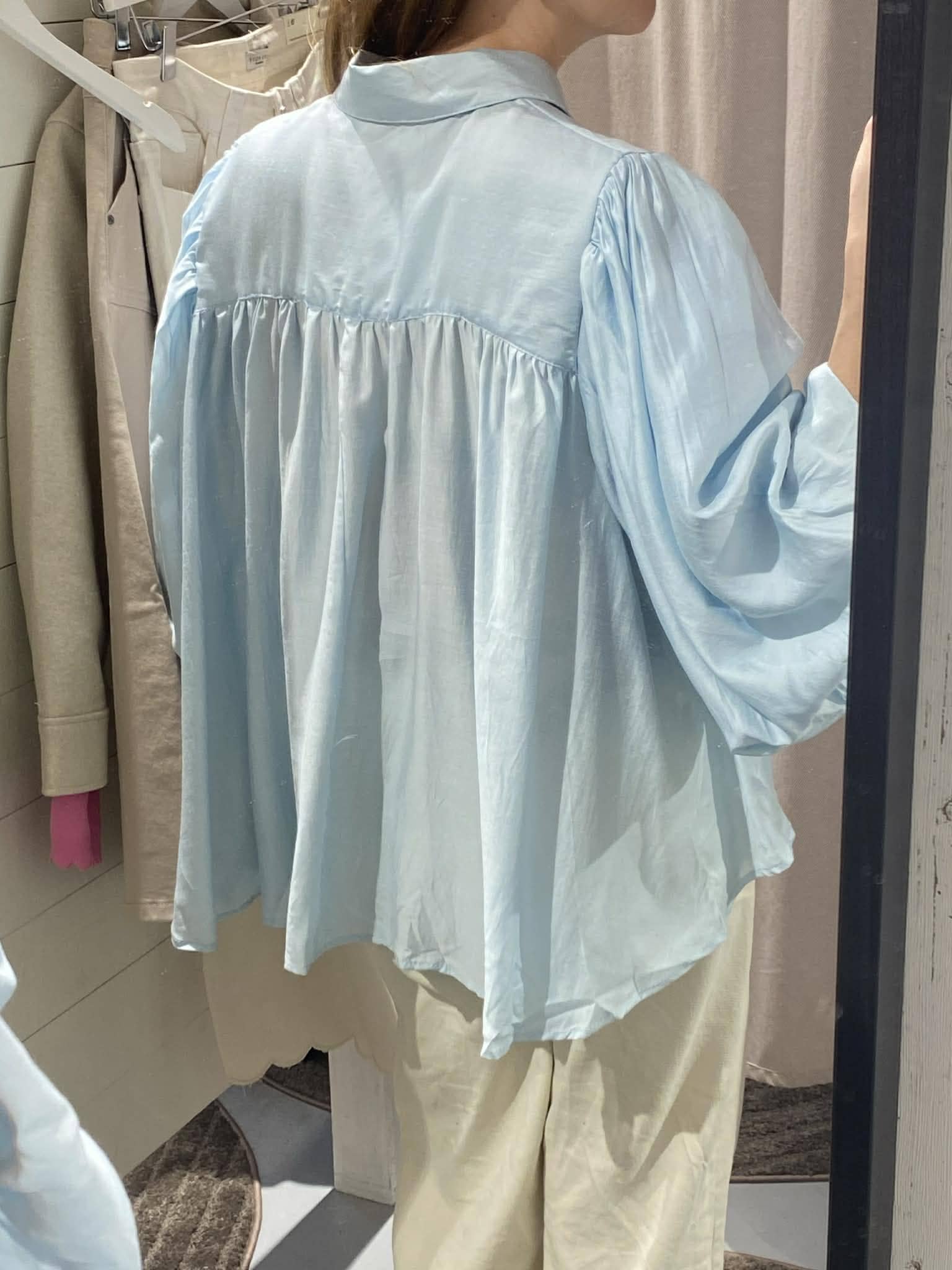 Skir blus med knäppning hela vägen fram och skjortkrage. Vida ballongärmar i trekvartslängd. Liten puff på axeln. Fin rynkad sömm i ryggen, vid modell. Längre baktill. Onesize.