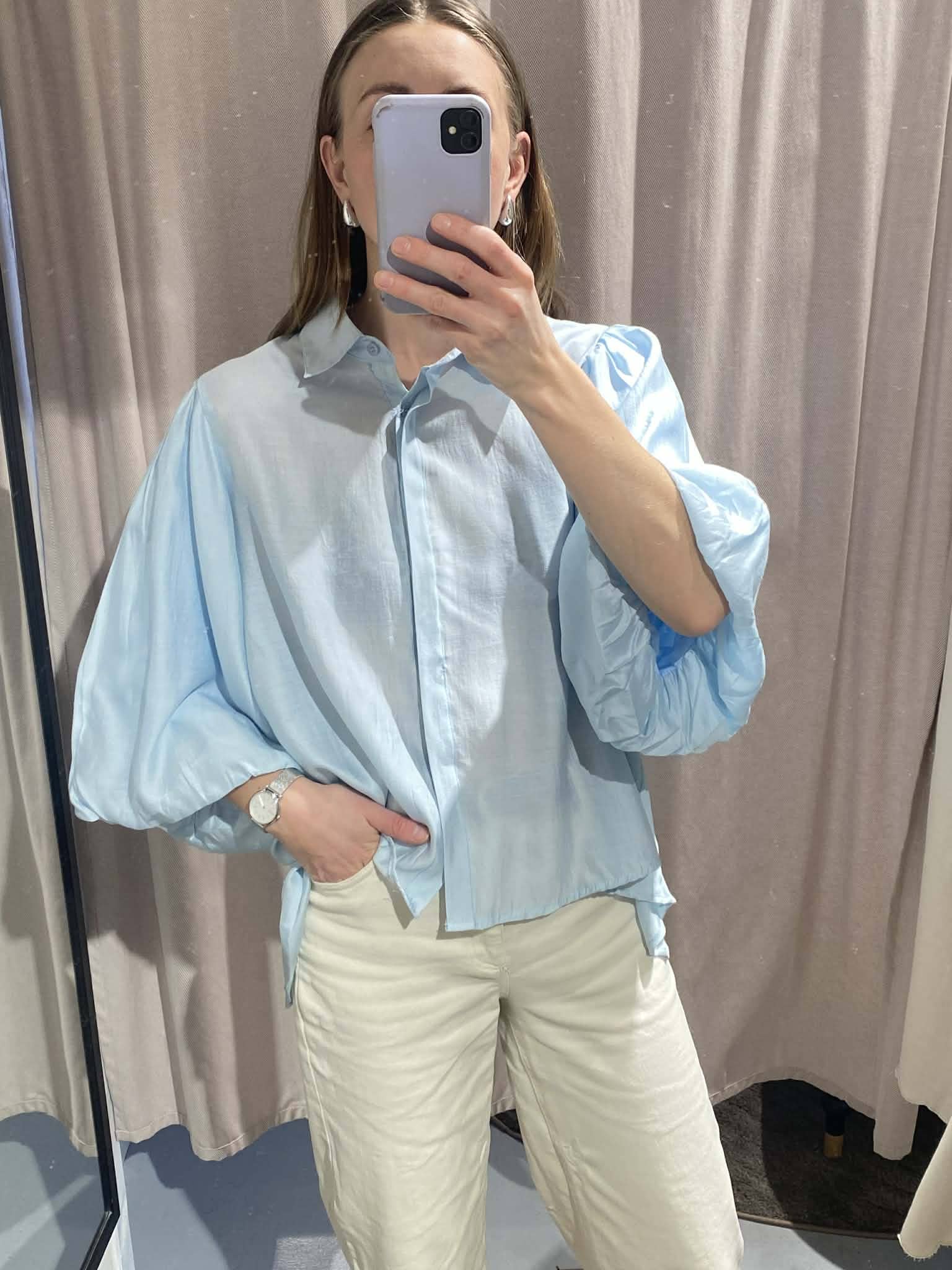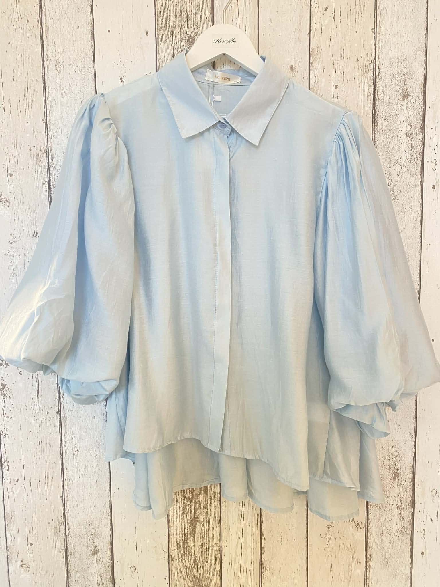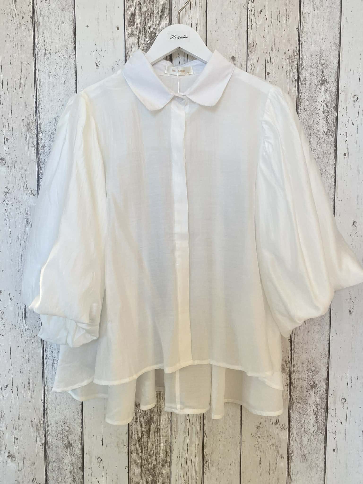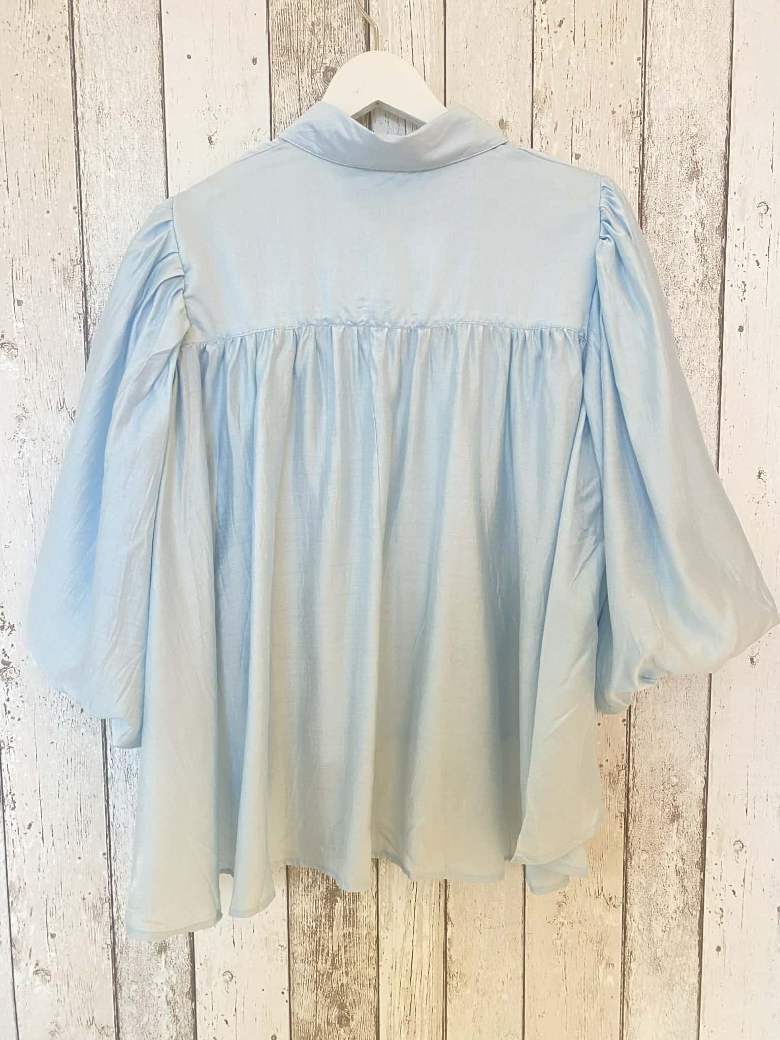 Skir blus med knäppning hela vägen fram och skjortkrage. Vida ballongärmar i trekvartslängd. Liten puff på axeln. Fin rynkad sömm i ryggen, vid modell. Längre baktill. Onesize.