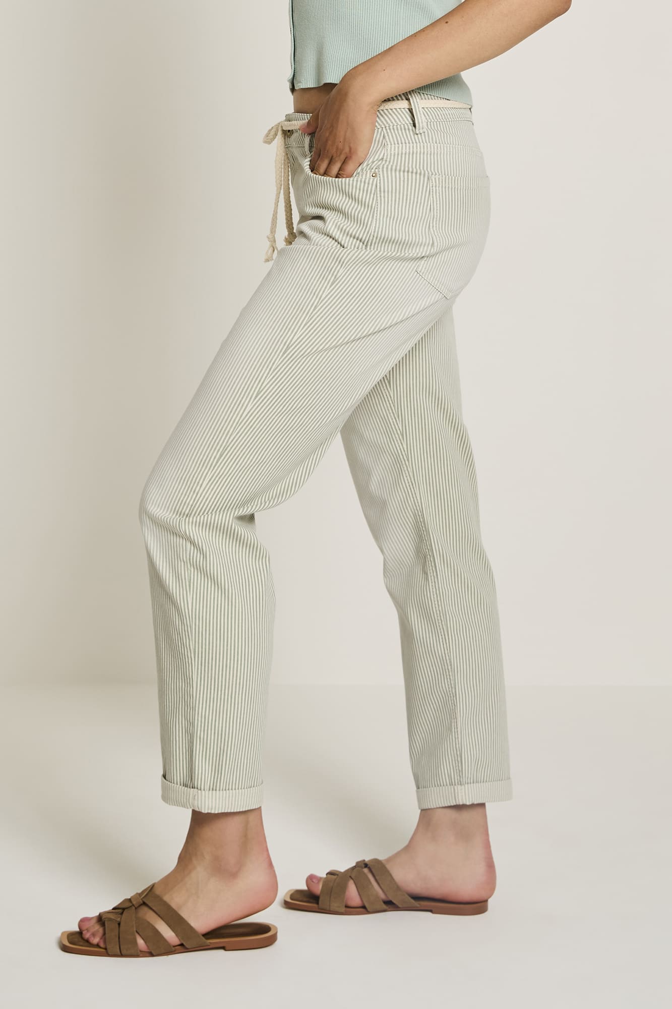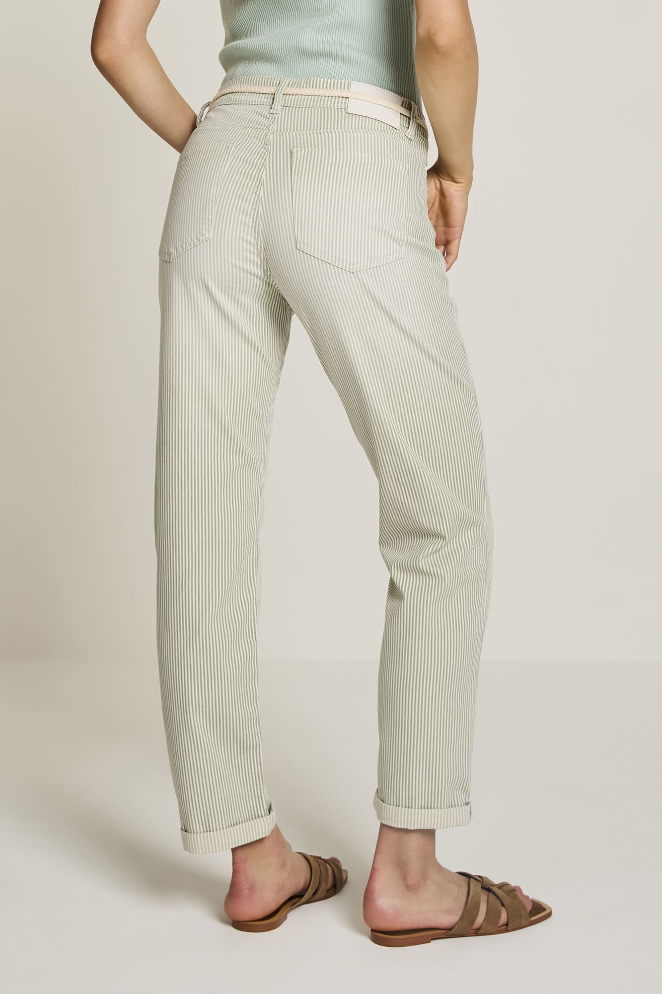 Byxa ”Bobby” från ParaMi i en vårig grönrandig färg. En lös passform med något avsmalnade ben. Medföljande skärp för en somrig look. 5-ficksmodell med gylf och hällor.