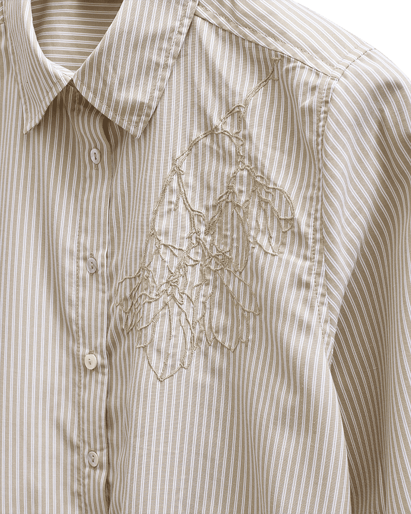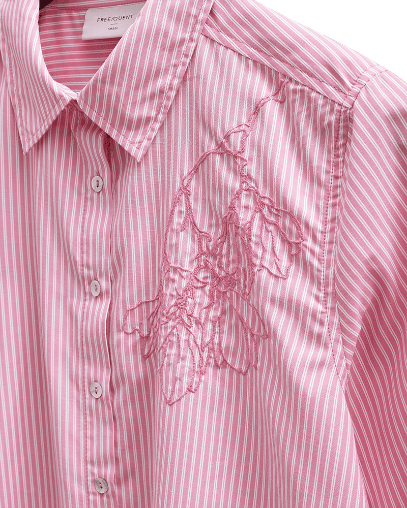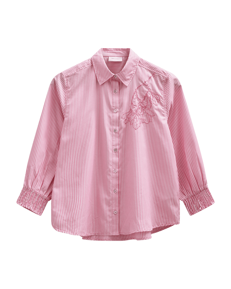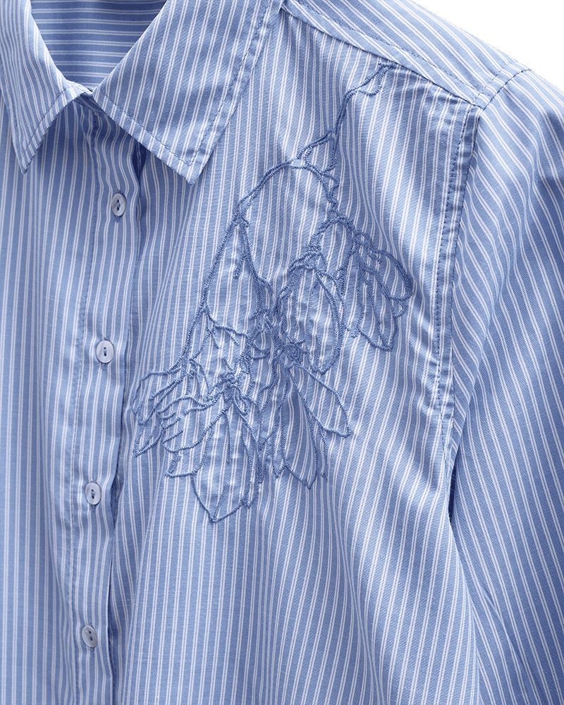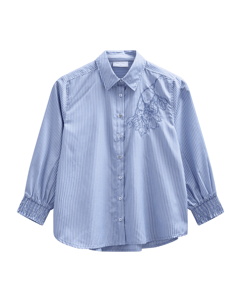 Skjortblus med trekvartsärm och skjortkrage. Lite utsvängd, rak modell. Broderade detaljer fram. Finns i 3 färger.