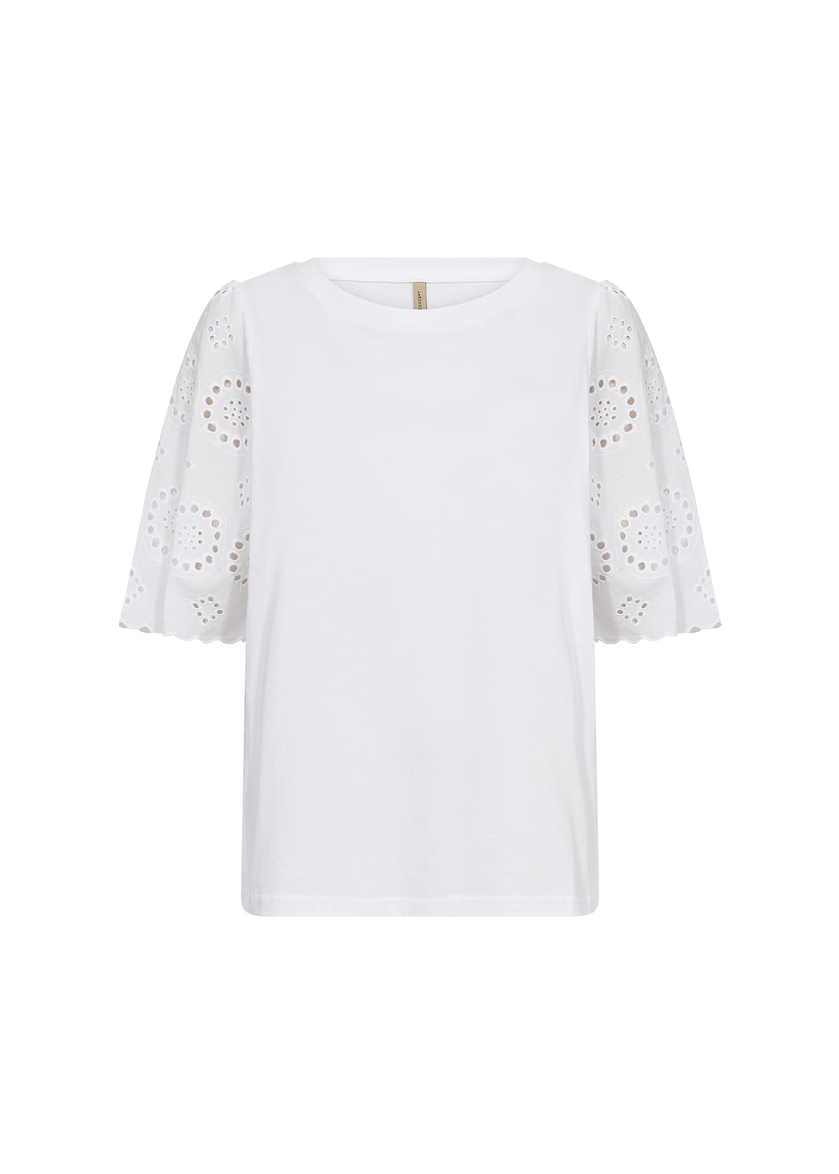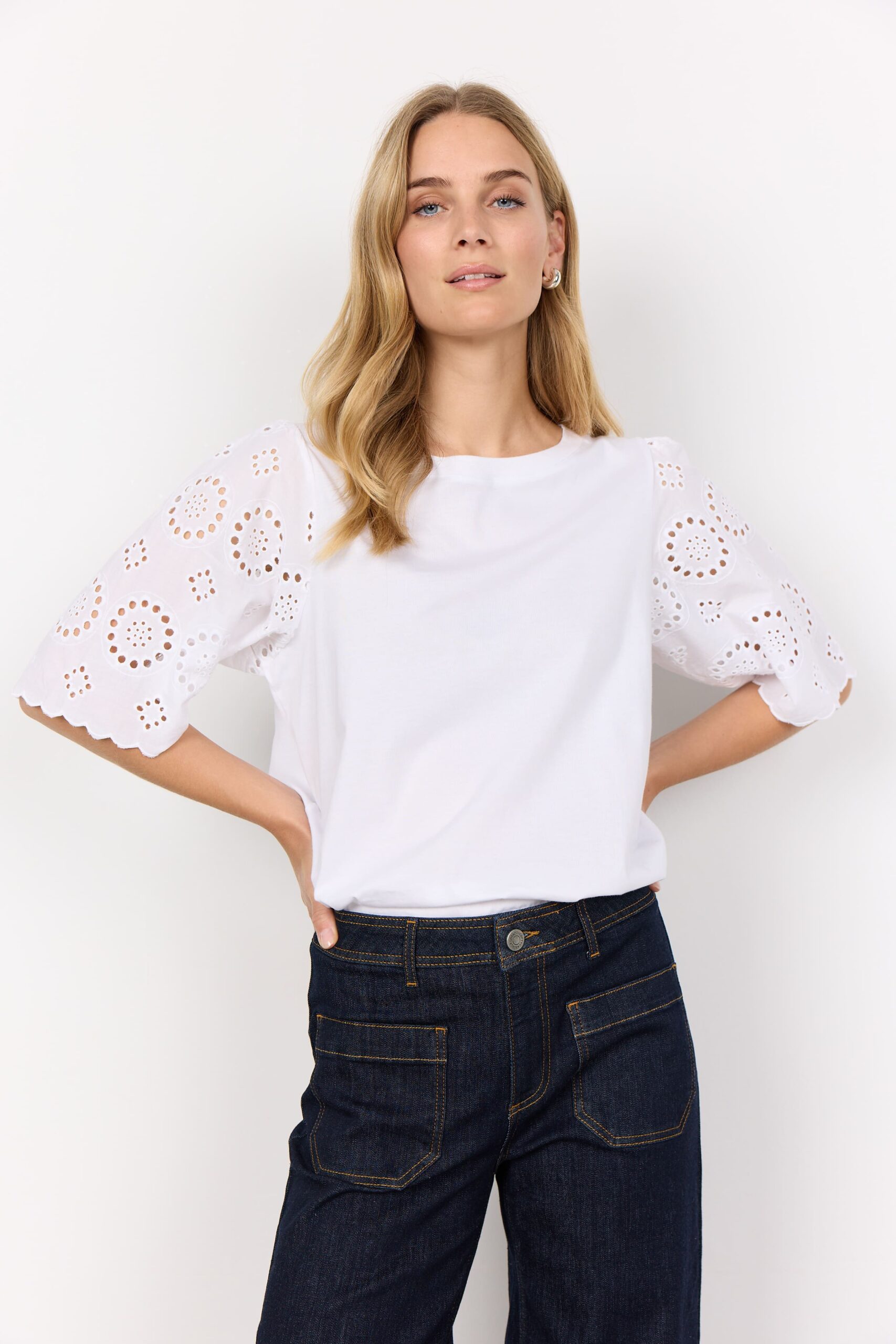 T-shirt med rund hals. Vida broderade puffärmar.