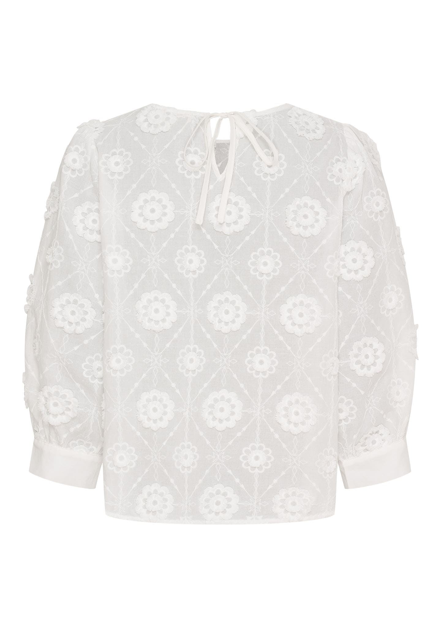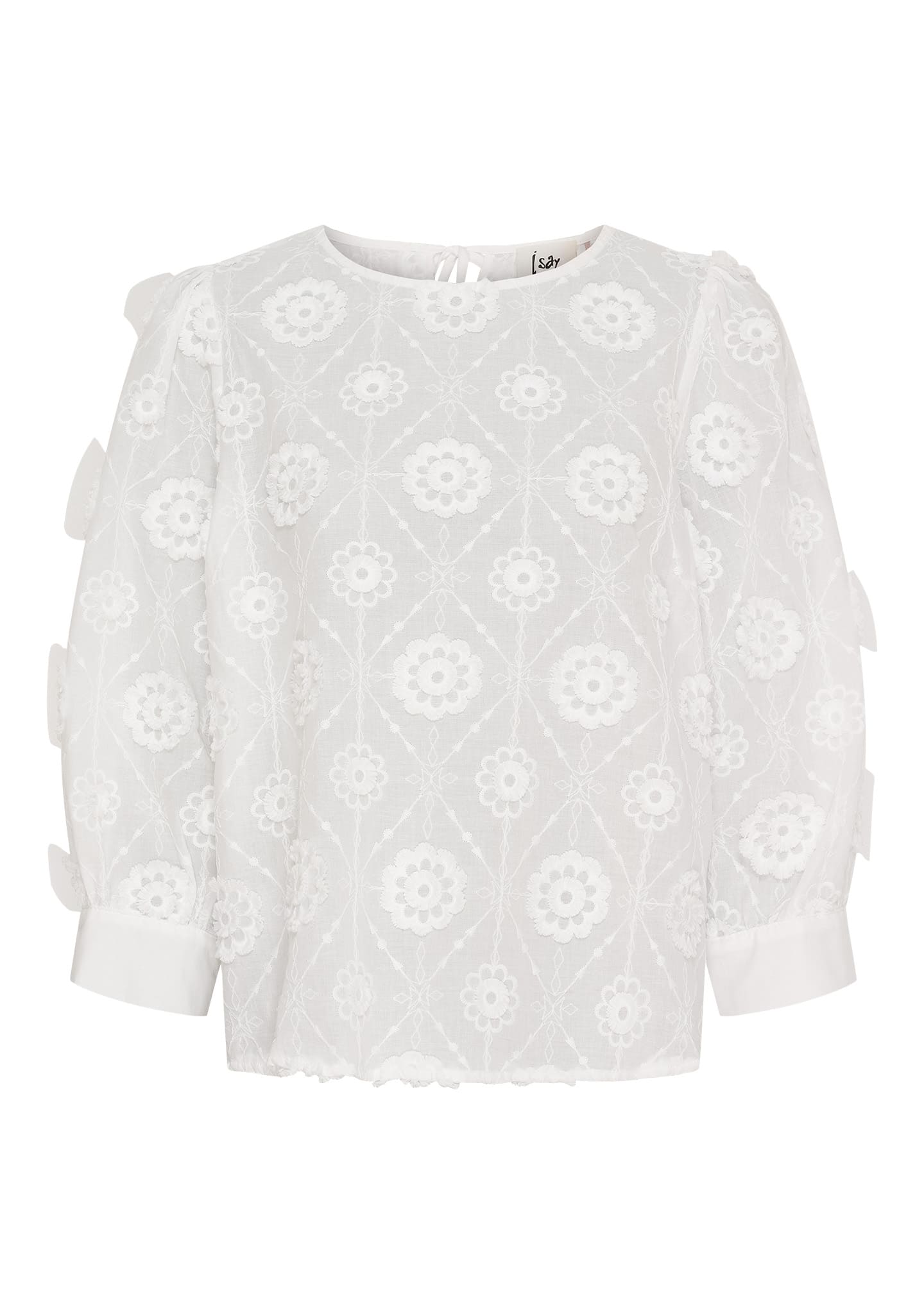Broderad blus med korta ärmar. Rund hals, vid/klockad passform.
