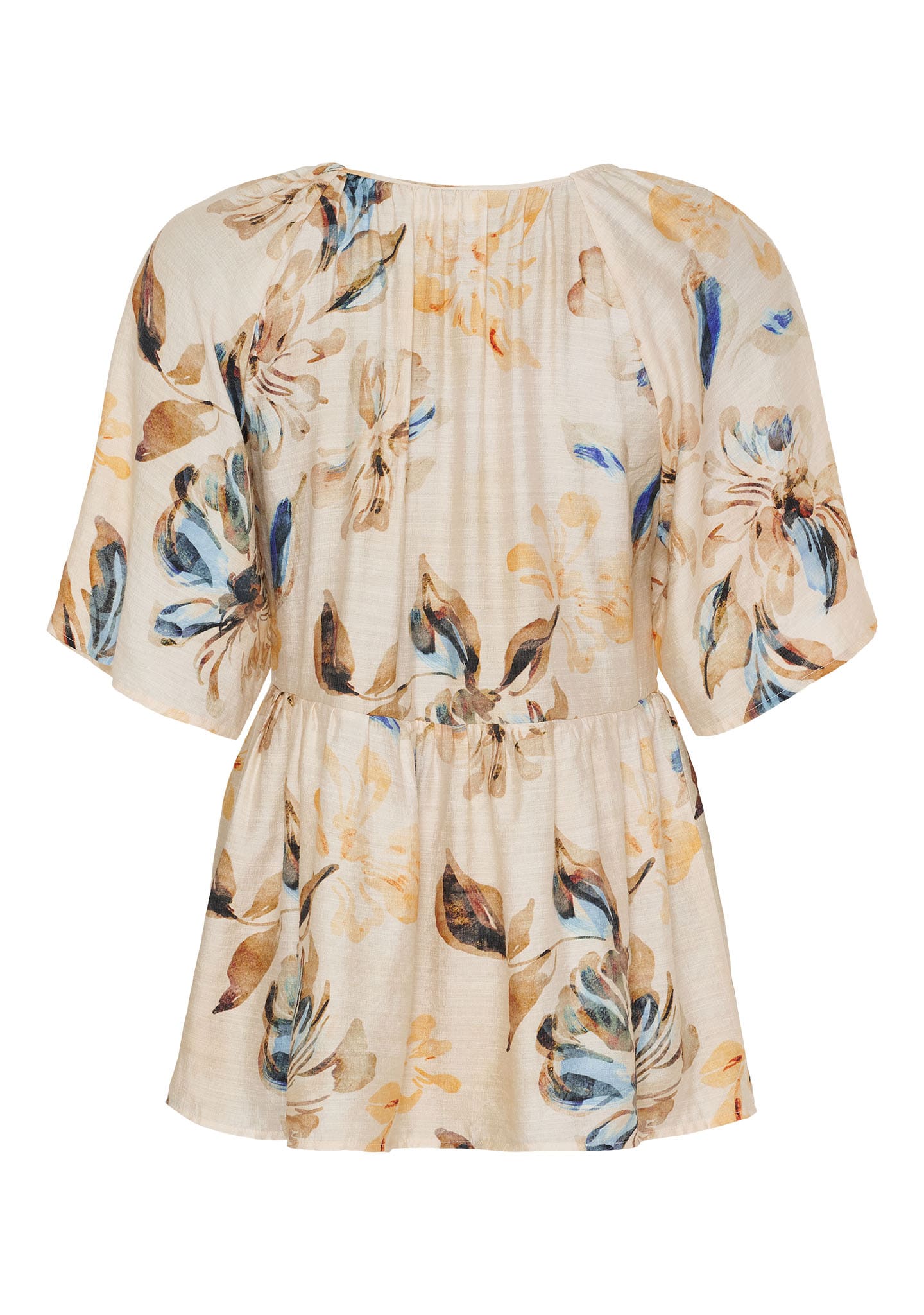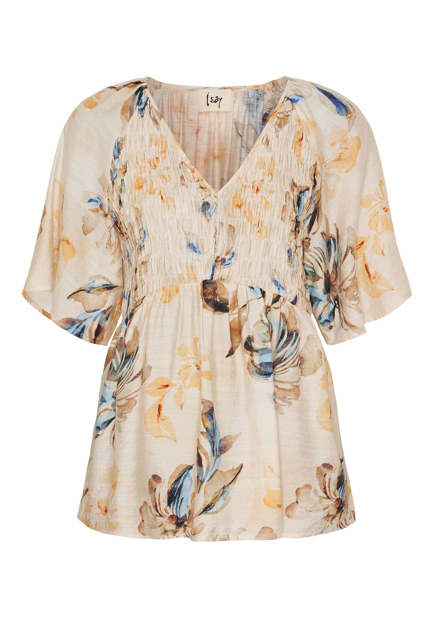 Blus med smockade detaljer vid bröstet. V-ringad hals och vida korta ärmar.
