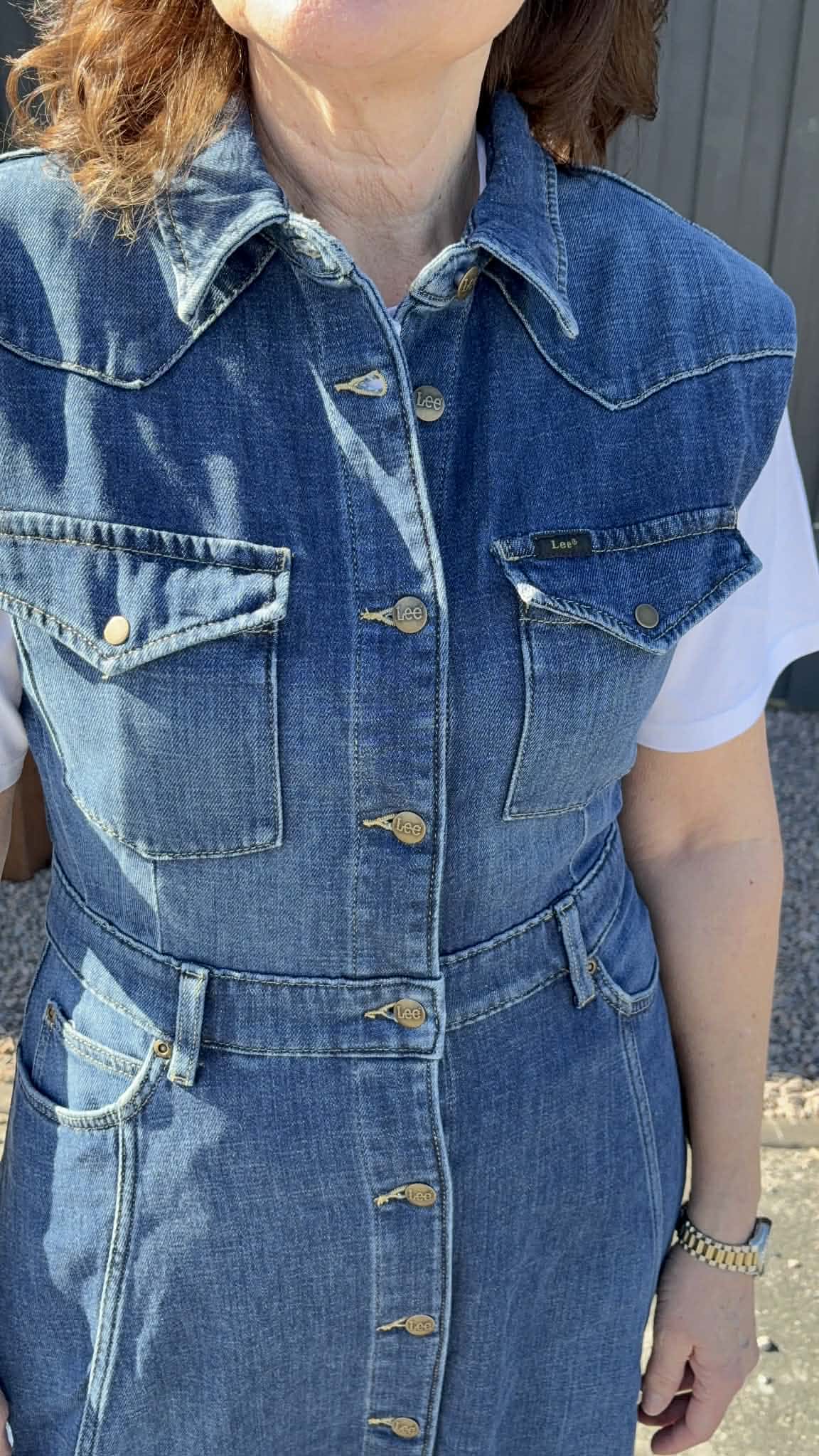 Lång jeansklänning med kort ärm. Knappar hela vägen fram, 2 bröstfickor och 2 sidofickor. Hällor i midjan för bälte. Skjortkrage. Vadderade axlar. Klockformad kjol.