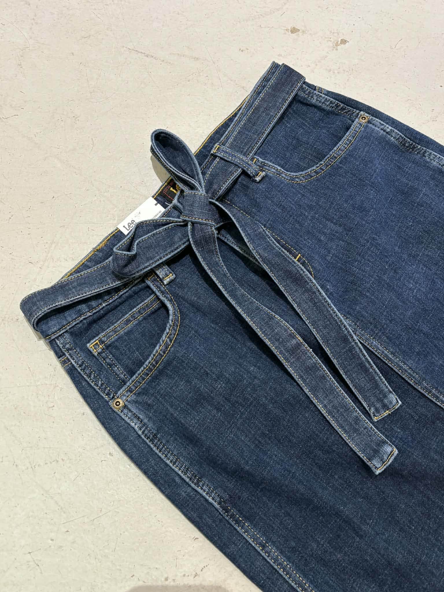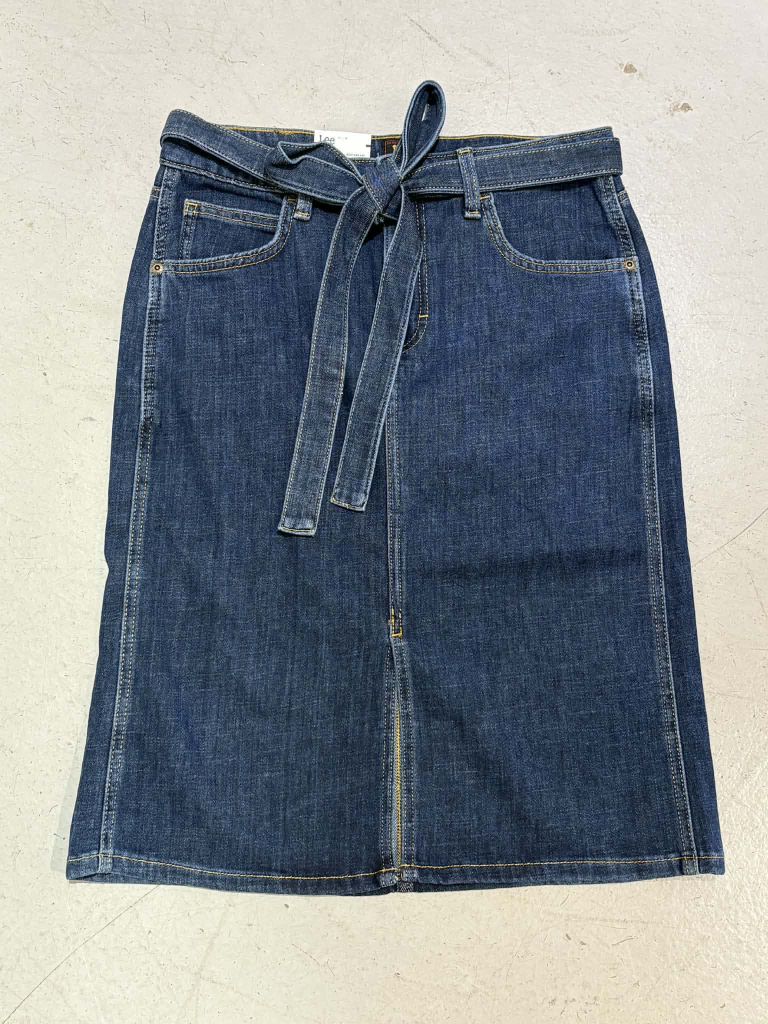 Jeanskjol med skärp. Femficksmodell, knälång och slits fram. Stretch.
