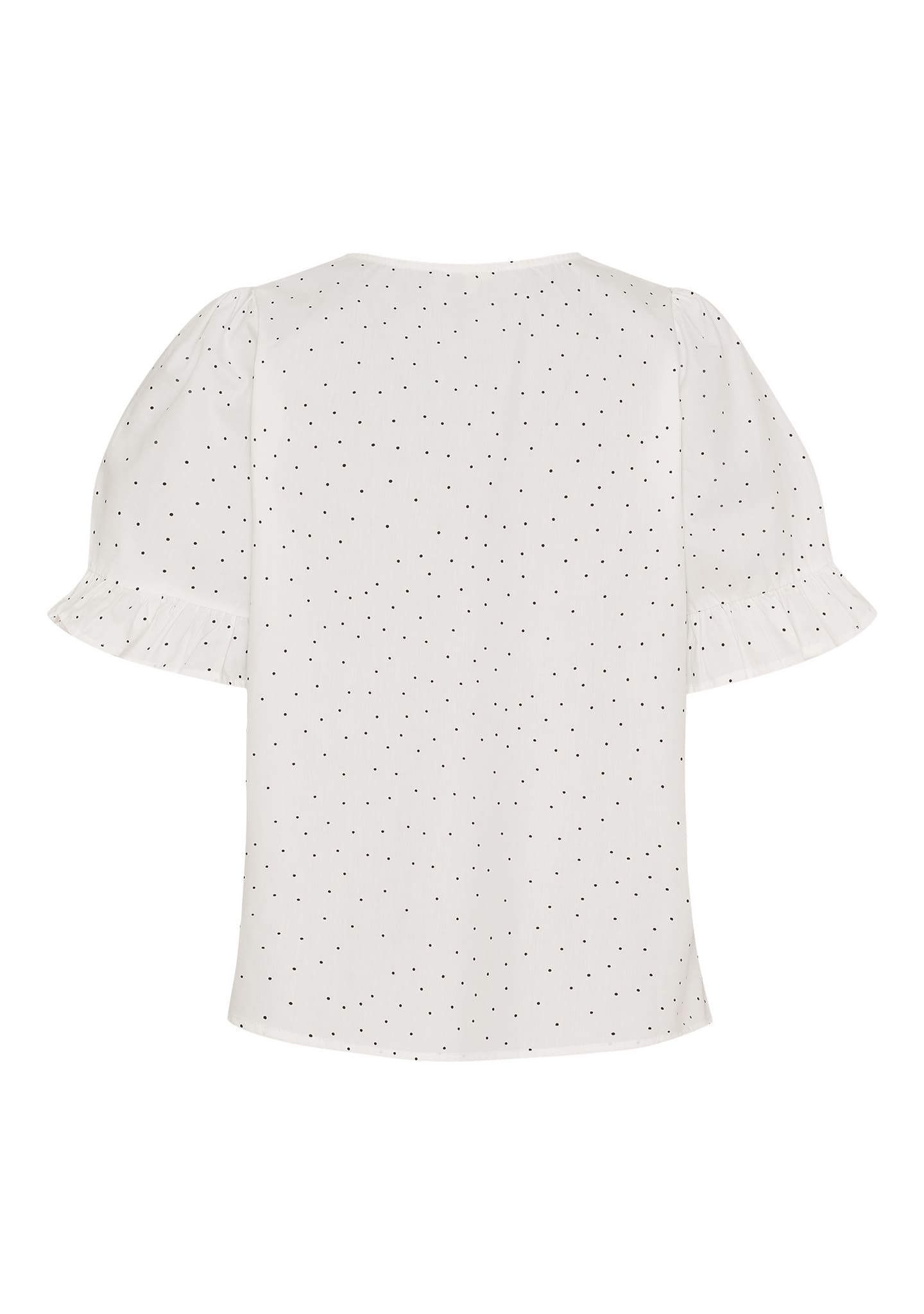Blus i 100% bomull. V-ringad med korta ärmar med volangkant. Tyget har en lätt fasthet, vilket gör att den faller snyggt och behåller sin form – samtidigt som den känns lätt på kroppen.