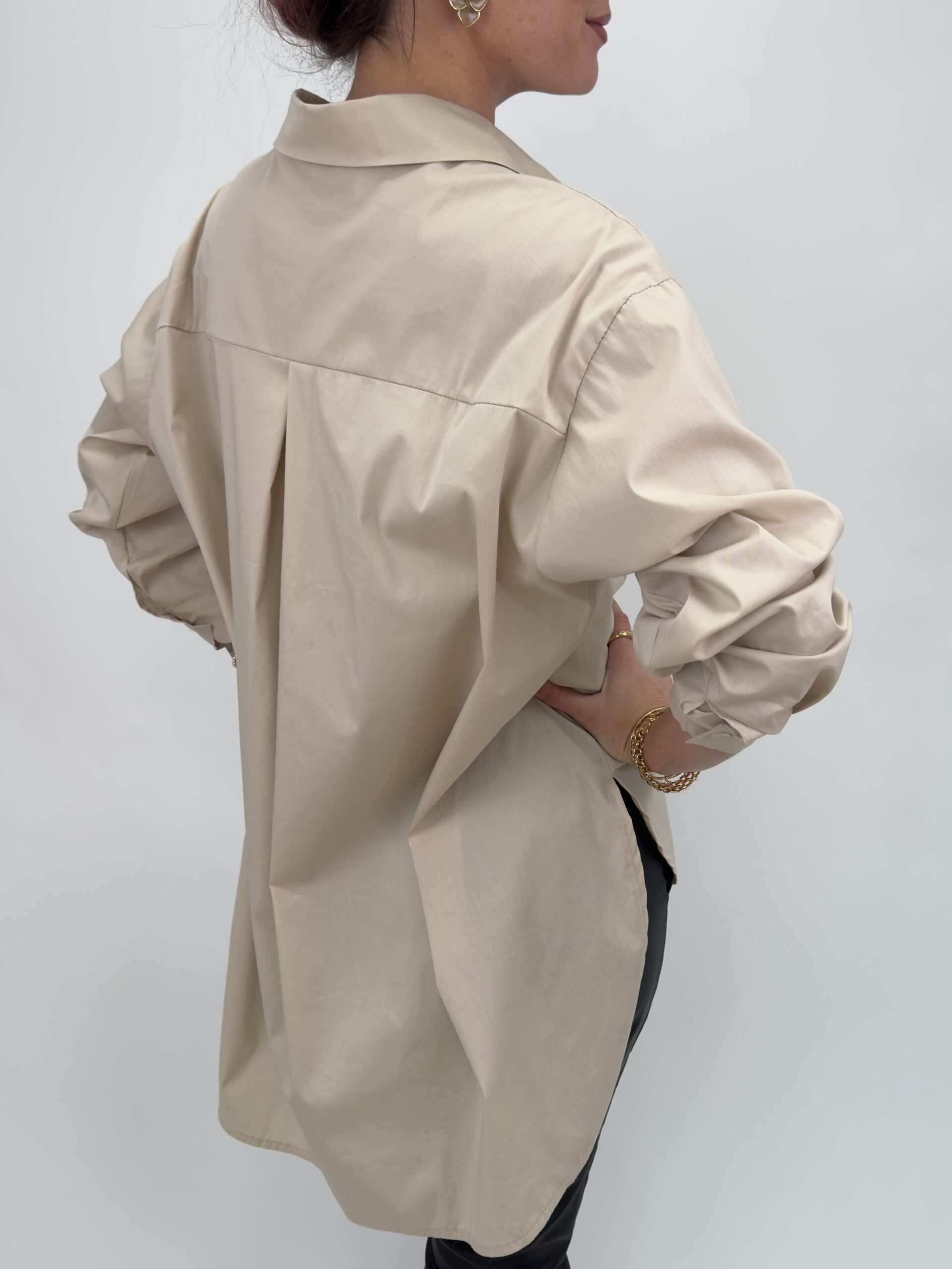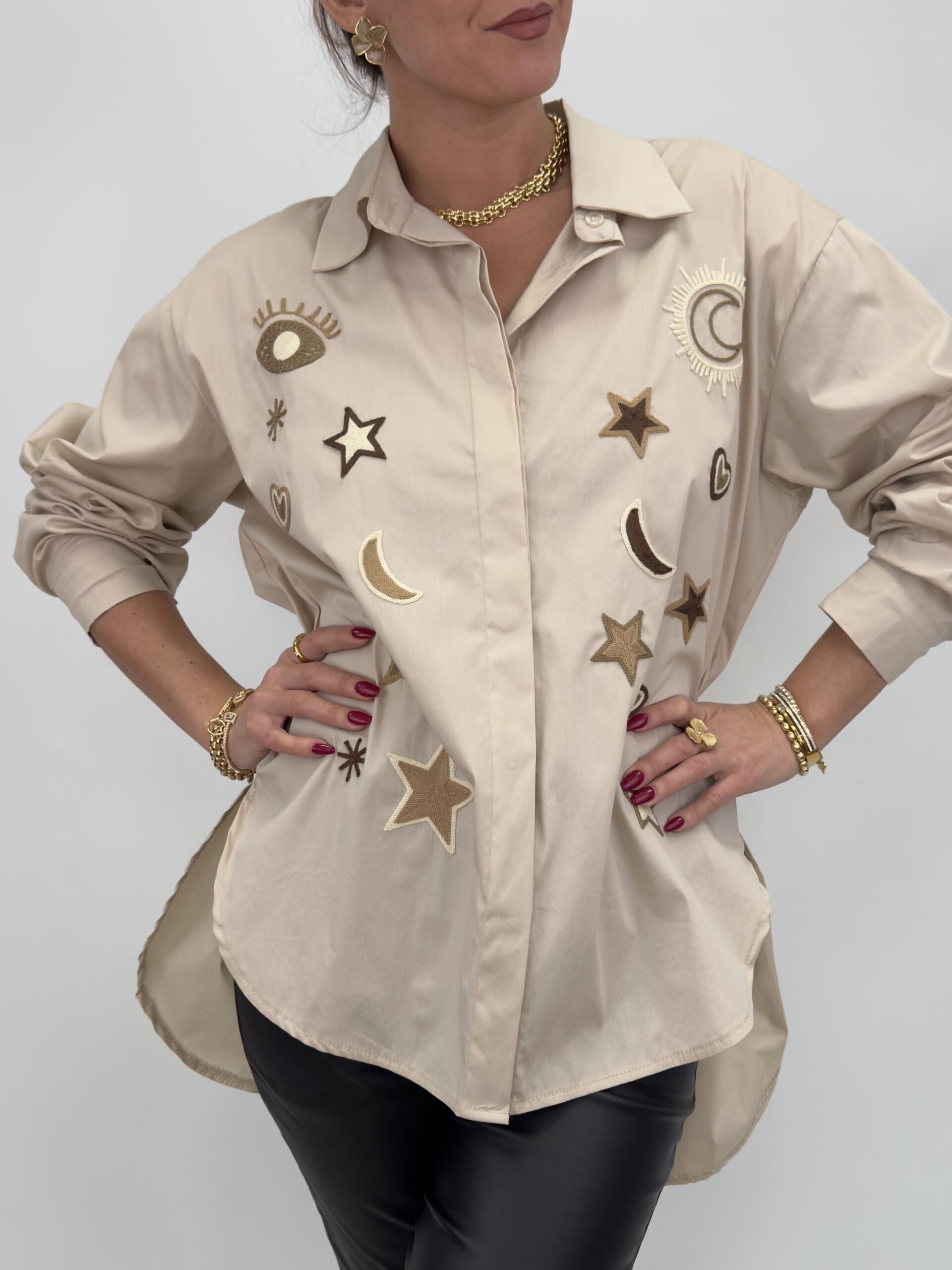 Skjorta med broderade detaljer fram. Skjortan är en oversized längre modell som är längre baktill. Onesize.
