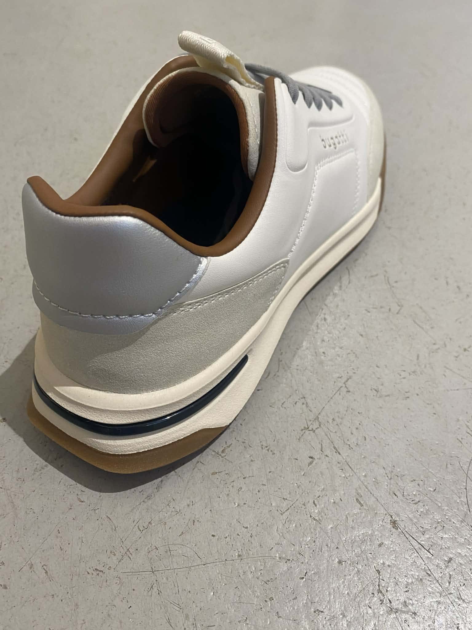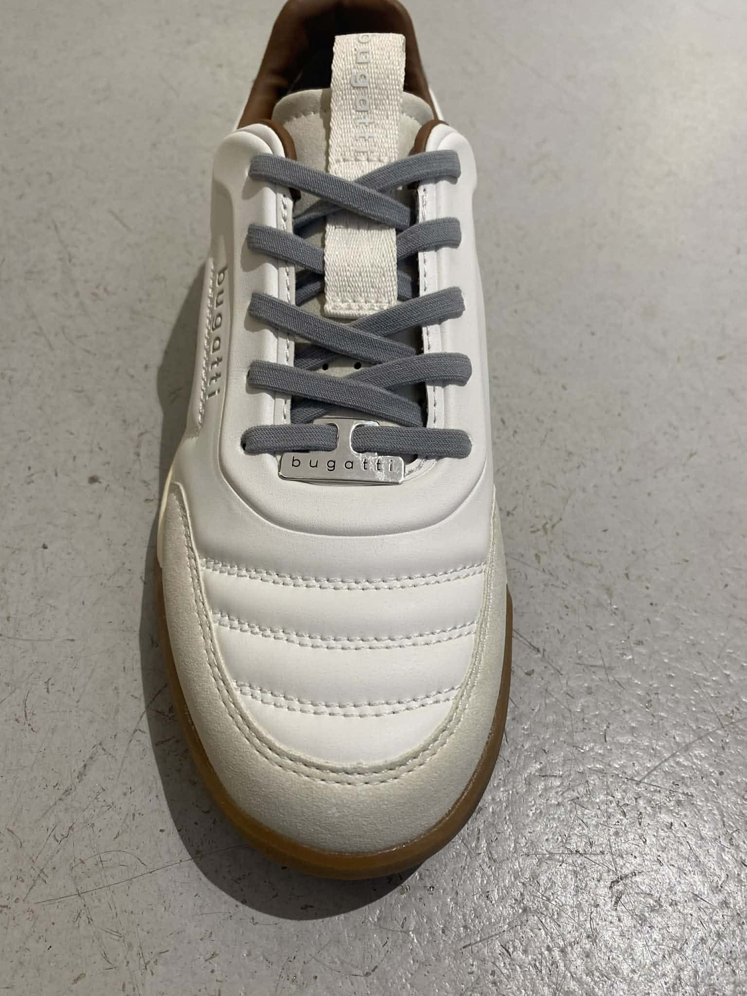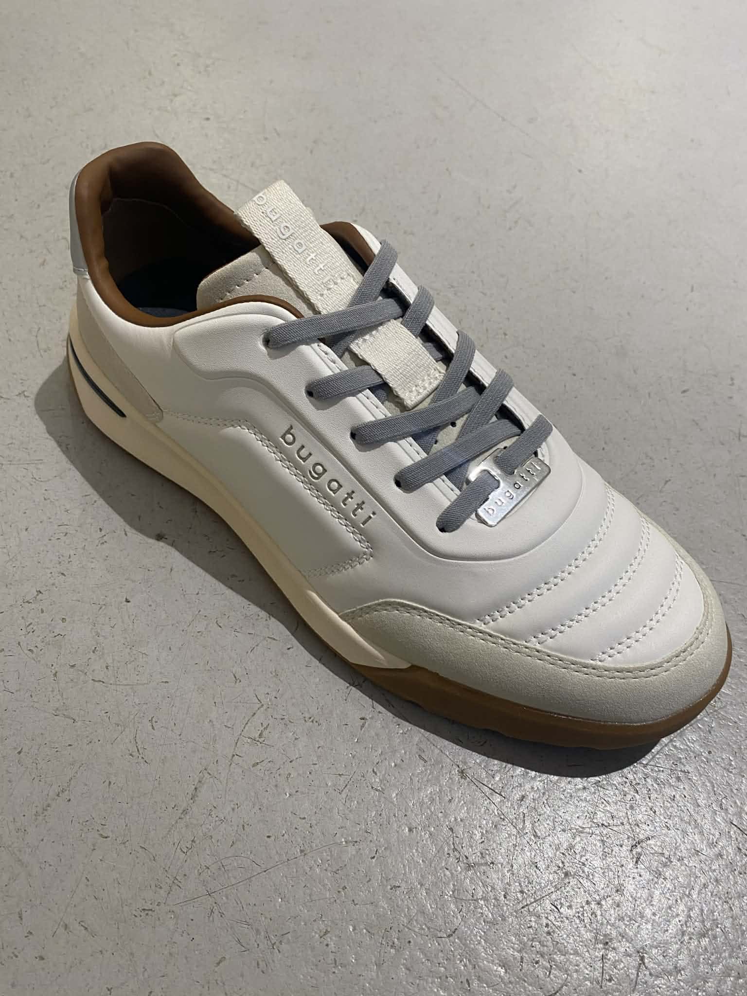 Vit sneakers från Bugatti. Knyt med snöre. Grå detaljer och brun insida.