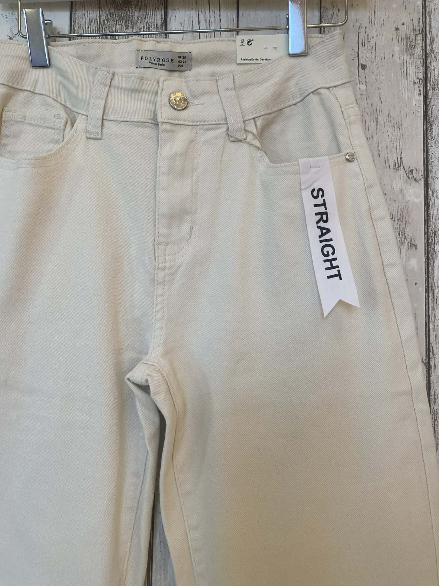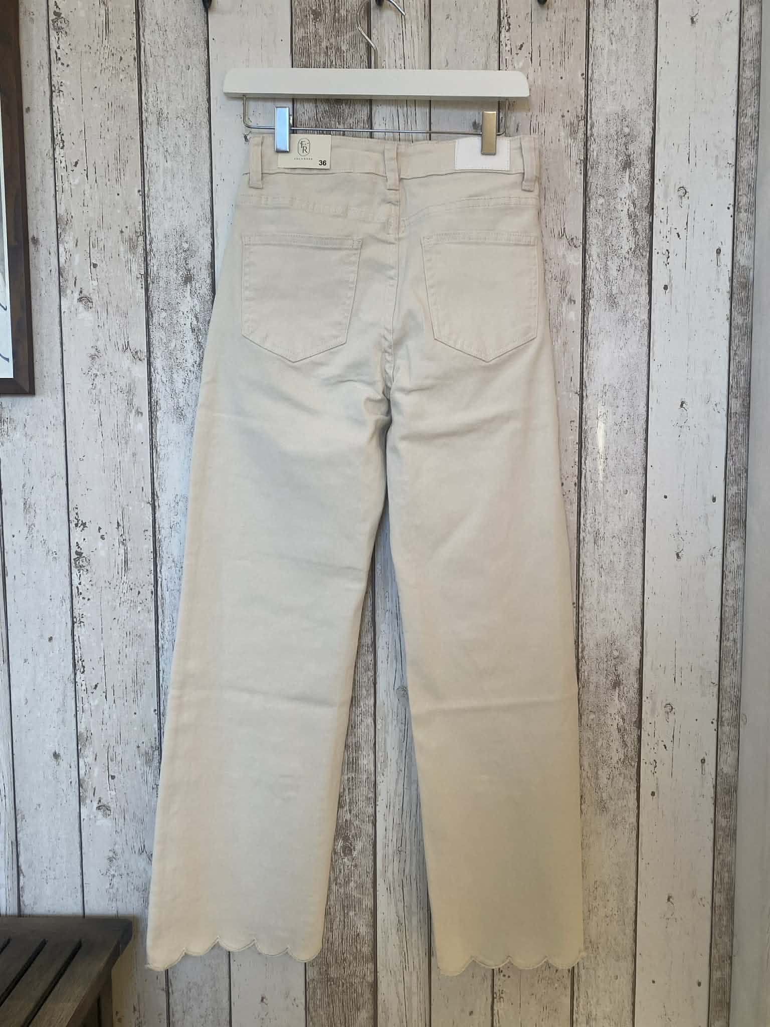 Mjuk och stretchig jeans med hög midja. Raka ben med volangdetalj längst ned. Stretchen töjer sig så tips är att gå ned en storlek.