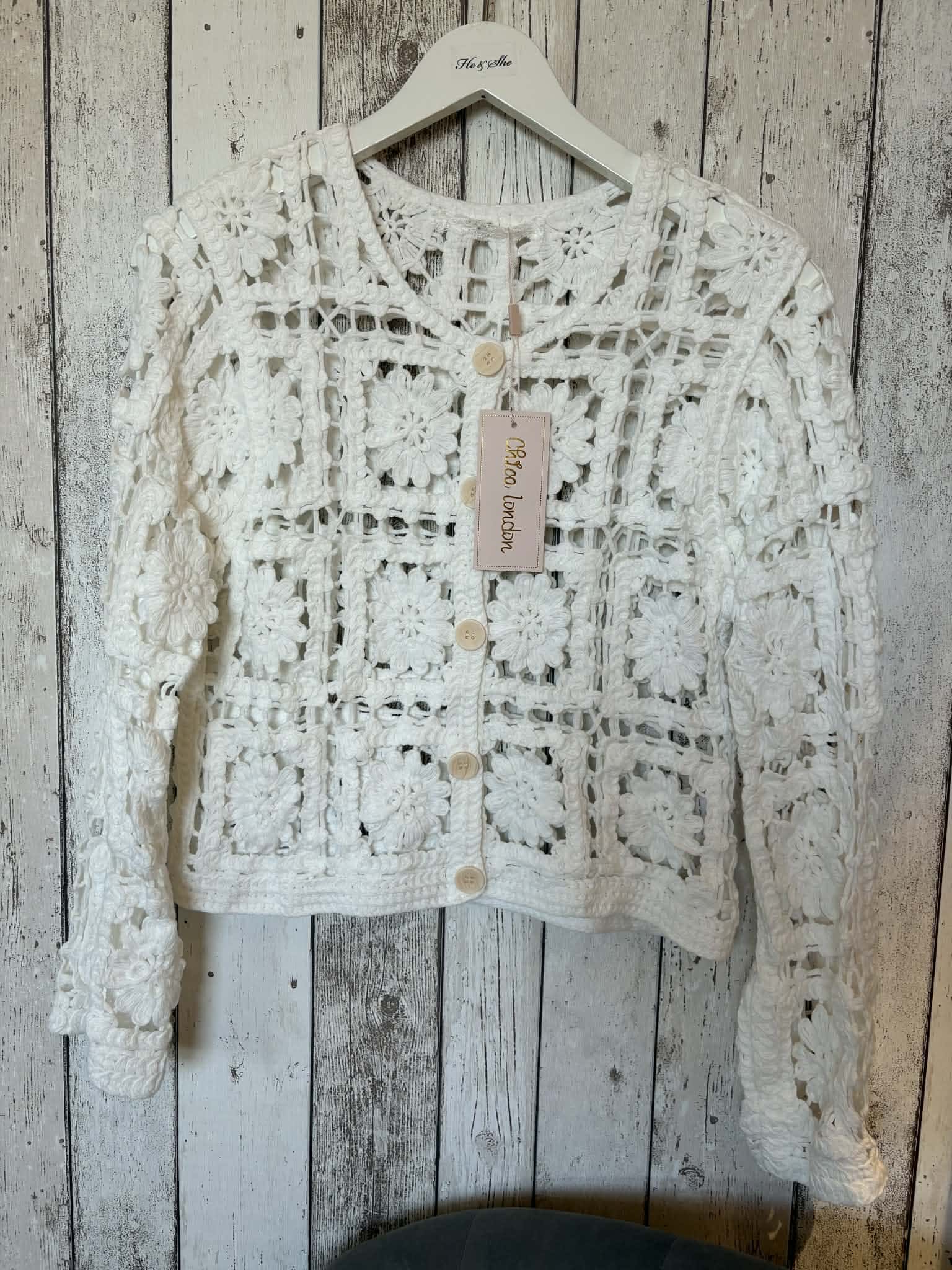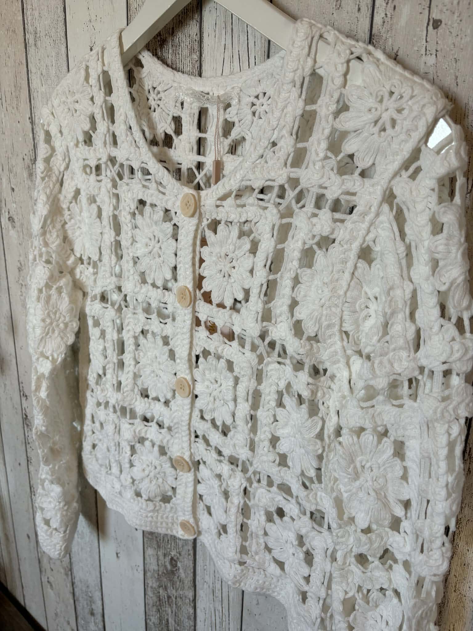 Virkad kofta med hellånga ärmar.